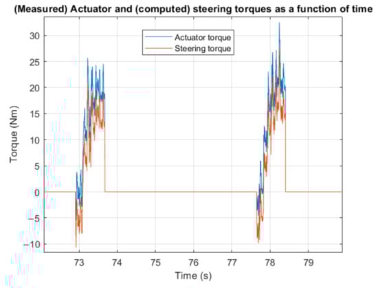 Example of collected data: torque measured by the actuator and computed steering torque (both in Nm) as a function of time (elapsed since the beginning of the experiment, in s) for two subsequent control actions of a participant during the pilot experiment.