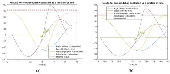 Example of pilot experiment results: pendulum angle (predicted/without human action vs. actual/with human action, in °), pendulum speed (predicted/without human action vs. actual/with human action in °/s), and steering torque (in Nm) as a function of time (elapsed since the beginning of the experiment, in s) for two successive tries: (a) unsuccessful; (b) successful.