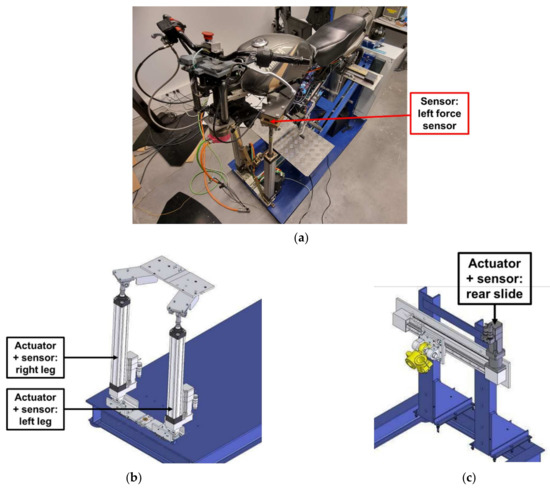 (a) Localization of the force sensors (used for roll torque computation); (b) CAD model of the front legs (used for roll and pitch rendering) and localization of the sensors and actuators; (c) CAD model of the rear slide (used for yaw rendering) and localization of the sensors and actuators (copyright: TS2—SATIE—MOSS, Univ Gustave Eiffel).