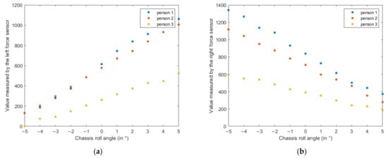 Data used for determining the corrected force values as a function of chassis roll angle: values measured by the force sensors (dimensionless 12 bits values ranging from 0 to 4095) as a function of chassis roll angle (in °) without human action: (a) left force sensor; (b) right force sensor.