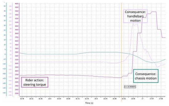 In the results pictured in Figure 19, the rider’s input stimulus, i.e., the steering torque, is initiated at 16.911 s. The measured handlebars speed (an output of the vehicle model and the handlebars model) starts to change at 16.916 s, i.e., 5 ms later. This time delay fits the design constraints for the steering column dynamic body (as described previously). The difference between the values measured by the left and the right force sensor, an image of chassis roll motion, starts to change at 16.938 s. This means that the chassis starts to be significantly tilted 27 ms after the input stimulus. This time delay is longer than the design constraints for this dynamic body, i.e., the actualization of the chassis DOFs at a period of 10 ms. However, this does not mean our expectations are not met; the roll DOF is significantly more limited in amplitude than the steering angle DOF. As a result, even if the roll angle computed by the motorcycle model starts to change after 10 ms, significant roll motion of the chassis (an output of the platform model) happens later. These preliminary results are promising.