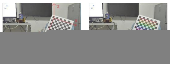 where is the scale factor, which represents the distance from the corner in the figure to the camera imaging plane, (,) is the pixel coordinate of the corner point, (, , ) is the world coordinate of the corner point, and the right side of (1) is the internal parameter matrix of the camera and the external parameter matrix of the relative pattern, respectively. Since we specified = 0 as the plane of the pattern, the value of all corner points was 0; as such, Equation (1) could be simplified follows:
