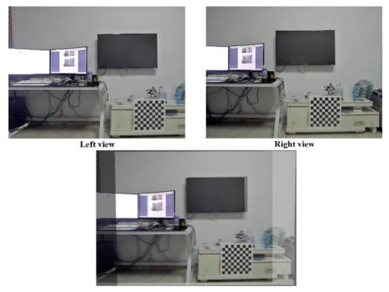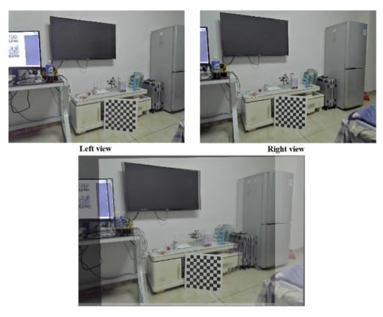 As can be seen in Figure 4, the checker pattern was fixed on the vertical plane of the cabinet and TV cabinet respectively. The binocular camera was placed at a position whereby the baseline was parallel to the wall. Therefore, it was considered that a stable projection model had been established. The external parameters were calibrated when the reference object was in this attitude and were used to construct the coordinate transformation relationship for image registration; the effect of this is shown in Figure 5 and Figure 6. Although there were still a number of ghost dislocation phenomena in the stitching results, the plane behind the pattern achieved a relatively good stitching effect. This was because although the pattern and the object behind it were not on the same planes, the two planes were approximately parallel. It could be determined that the TV plane and the pattern plane had the same rotation matrices relative to the camera imaging plane, and that the translation vector was only slightly different in the component. Therefore, using the external parameters calibrated by the checker pattern to construct the projection transformation relationship can also result in a better image stitching effect for the plane behind it.