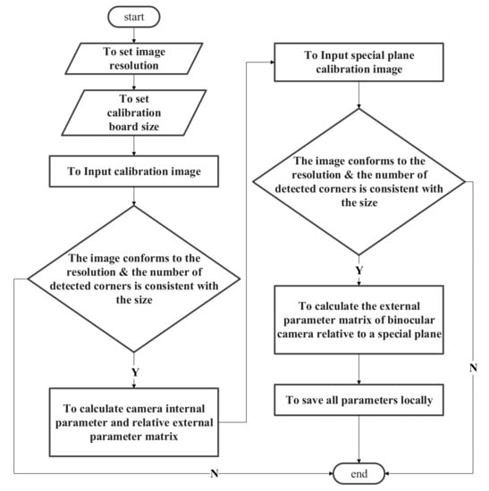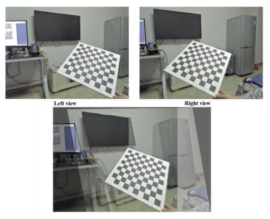 After binocular calibration, camera calibration based on the special plane was carried out. The binocular camera was placed in a position whereby the imaging surface was parallel to the wall, and the pattern was fixed on the vertical plane in the overlapping area for photographing. The method is shown in Figure 14.