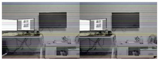 The left and right viewing angles of the image to be stitched could then be transformed into a horizontally aligned attitude through the correction matrix, and the stereo correction results could be obtained by mapping the projection matrix to the new coordinate system. Next, we searched the corresponding points of the left and right viewing angles in the one-dimensional space, calculated the parallax and depth information, and obtained a depth map which we used to layer the image. The effect is shown in Figure 16.