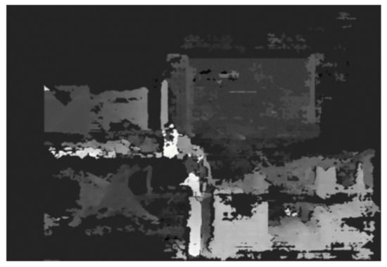 After stereo correction, each pixel in the left and right viewing angles was almost on the same horizontal line. The stereo matching algorithm then searched for the matching pixel on the corresponding horizontal line in the right-hand side image in Figure 7. The search method involved setting an odd-size sliding window, using the minimum and maximum parallax in the two images to determine the starting point and endpoint of the search, and calculating the sum of the absolute value of the gray value difference of the corresponding pixel points in the two image windows as the matching basis and selecting the point with the minimum value in the process from the start to the endpoint as the best matching point. Subsequently, the pixel coordinates of the pixel points corresponding to the left and right views in the overlapping area could be obtained. Parallax d of the point could be obtained by subtracting the abscissa of the two points. The calculated disparity map is shown in Figure 8 with the parameters and the stereo-corrected image as input.