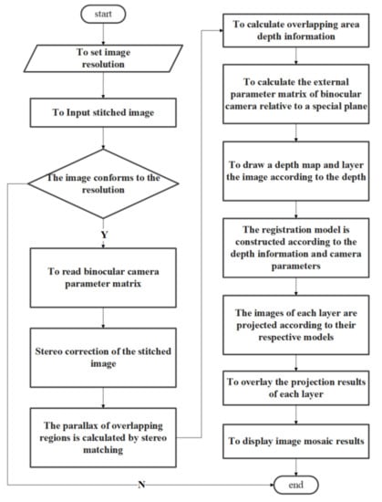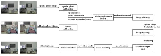 To begin, the internal parameters and the external parameters were solved by calibrating the camera. Then, using the camera calibration method based on the special plane, an additional group of pictures parallel to the camera imaging plane were taken and used as input data to solve the external parameter matrix representing the pose relationship between the pattern and the camera imaging plane. Using the external parameter matrix and the internal parameters, the coordinate transformation relationship of the binocular camera about the point on the distance plane could be constructed. In addition, the stitched image had to be layered through the layered projection method based on depth information. We then used the external parameters of the calibrated binocular camera to stereo correct the left and right viewing angles so that the corresponding pixels in the image would fall on the same horizontal line. Next, we searched the corresponding pixels in one-dimensional space using the stereo matching algorithm and obtained their horizontal parallax. After obtaining the disparity map in the above way, we calculated the depth map according to the focal length of the camera and the length of the baseline and divided the depth map according to the specific situation. Finally, the original floating map was layered according to the layered model of the depth map, and the corresponding depth information was substituted into the coordinate transformation relationship so that each layer of the image was projected according to its registration model. All projection results could then be superimposed to obtain the final image stitching result. Since the parallax of objects at the same distance imaged on the camera plane was the same, the layered projection method based on depth information could maximally eliminate the impact of parallax. The process is shown in Figure 12.