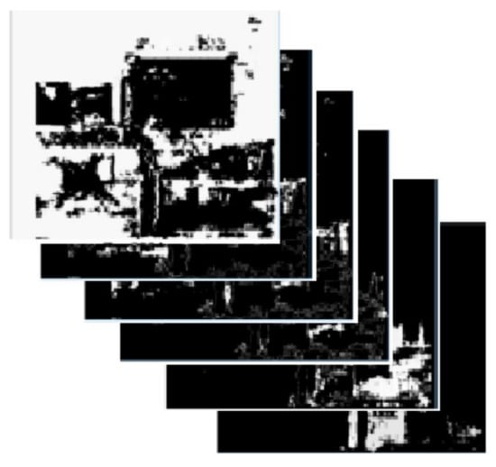 where is the number of pixels in the horizontal direction occupied by the focal length of the two cameras after stereo correction, is the distance between the optical centers of the two cameras, and is the parallax of the pixel points. After converting the disparity map into a depth map, the image was layered; the effect is shown in Figure 9. The pixels in the scene were divided into several layers according to the depth information, and the average value of the depth information in each layer was recorded. At the same time, the original image of the camera angle on the right was also layered in this way, and the parts outside the overlapping area were incorporated into the layer of adjacent pixels in behavioral units. The effect is shown in Figure 10.