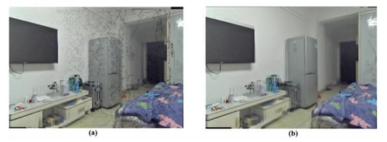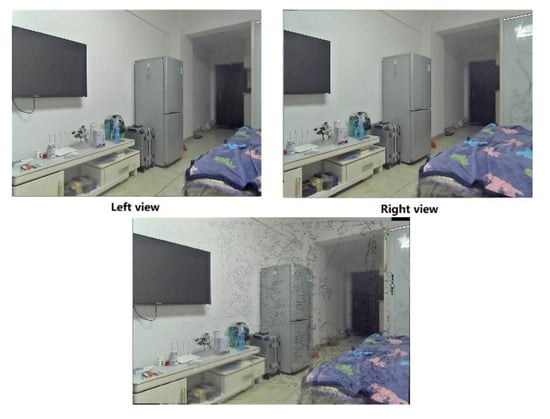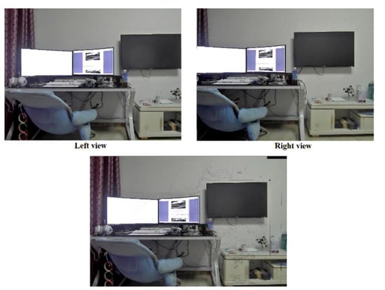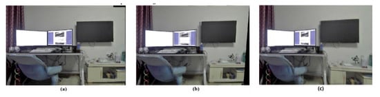 As shown in Figure 22, using the method based on depth information layering (Figure 22a), most of the objects in the scene achieved good results, with only the seat closest to the camera showing a small amount of ghosting. Meanwhile, in the results obtained using the two image stitching method based on feature points (Figure 22b,c), most objects showed ghosting, and the upper right corner of the TV set had significant deformation.