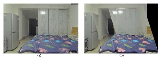 As shown in Figure 21, when the proposed method was used for stitching (Figure 21a), good results were obtained except for the closet gap. However, in the stitching results based on ORB feature points (Figure 21b), there were mismatches, because the feature points detected for the edges of the three closet doors were too similar. As such, the result was not satisfactory.