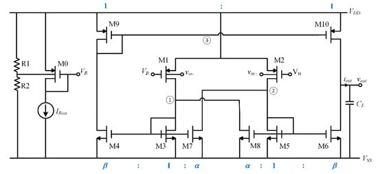 The schematic diagram of the proposed single-stage OTA is shown in Figure 1. Where not explicitly drawn, the bulk terminal of each transistor is assumed to be connected to its source. The circuit is made up of the bulk-driven non-tailed differential pair M1–M2 loaded by current mirror M3–M4 and M5–M6. The additional current mirror M9–M10 implements differential to single-ended conversion. The bias current in M1 and M2 is set through the diode-connected transistor M0, which generates voltage VB to be applied to the gates of M1–M2. The bulk terminal of M0 is biased by the voltage divider R1–R2, which is basically the analog ground i.e., the quiescent input voltage of the pair. More specifically, M0 and M1 (M2) act as a current mirror provided that Vin− = Vin+ = (R1VSS + R2VDD)/(R1 + R2), and in this case we get ID1,2 = IBias(W/L)1,2/(W/L)0.