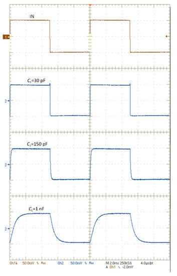 Figure 5 shows the transient response of the same sample in unity-gain feedback configuration for CL equal to 30 pF (loading capacitance equal to 30 pF represents the total load due to the package, the oscilloscope probe, and the PCB), 150 pF and 1 nF, confirming that the approximated single-pole transfer function in (5) well describes the OTA behavior.