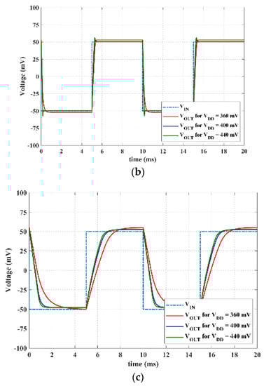 Simulated transient response for supply voltage variations of ±10% for: (a) CL = 30 pF, (b) CL = 150 pF and (c) CL = 1 nF.