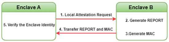 In Figure 2, enclave B must prove its identity to other enclaves on the platform for local attestation. In this case, Enclave B requires the hardware to generate a credential, also known as a REPORT. The REPORT contains the following data: the identity of Enclave B, the attributes related to Enclave B, the reliability of the hardware trusted computing base (TCB), the additional information that the Enclave B authenticator wants to deliver to the target Enclave A, and the message authentication code (MAC) tag. When the target REPORT structure is generated, Enclave B will request the REPORT identity and will pass the report to the final target Enclave A. The target Enclave A will then verify Enclave B, and will request attestation to determine whether it is on the same platform.