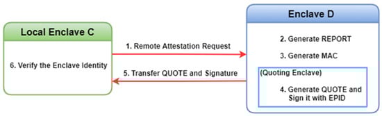 The remote attestation mechanism is an extension of the local attestation mechanism, but local attestation uses symmetric keys, while remote attestation uses asymmetric keys. In remote attestation, because the key to the processor needs to be accessed during the attestation process, the quoting enclave is used. In Figure 3, supposea remote attestation process where the authenticator, Enclave C, authenticates Enclave D. First, Enclave D needs to generate the REPORT hardware credentials, and the MAC is generated using the quoting enclave (Q) reporting key. Then package the above and additional information to Q. The quoting enclave can verify whether Enclave D works on this platform through the above content. Suppose Enclave D is determined to be on the same platform as itself. In that case, Q will pack the received content into a reference structure QUOTE, sign the QUOTE, and send it to Enclave C. Enclave C first verifies the correctness of the signature. It then uses QUOTE to conduct remote attestation after verification.