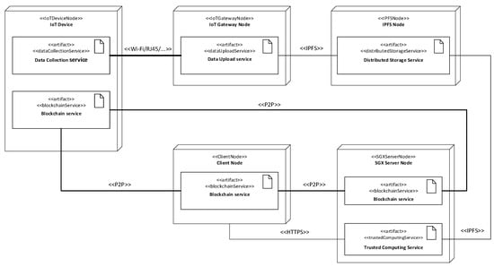 Professionals typically use unified modeling language (UML) to model system architectures. UML deployment diagrams are generally applied to physical structure modeling and functional to physical components mapping. Górski [] proposed a 1 + 5 architecture view model for designing blockchain and internet technology (IT) system integration solutions. They mainly described an integration flow diagram that extended the UML activity diagram. Inspired by their work, we use the UML deployment diagram to represent physical nodes and the allocation of components in this framework, as shown in Figure 5. Table 2 summarizes the stereotypes of nodes, services, and protocols in the UML deployment diagram.