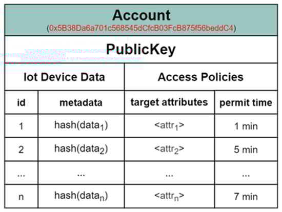 First, when a new IoT device node needs to be added to the framework, it needs to be approved by the  before it can connect to the blockchain network and then create the corresponding account. The IoT device’s public key uniquely identifies the device account. We use smart contracts to define the data structure of the IoT device account, the storage address index, metadata, and data access policy for the data. The specific data structure is shown in Figure 6.
