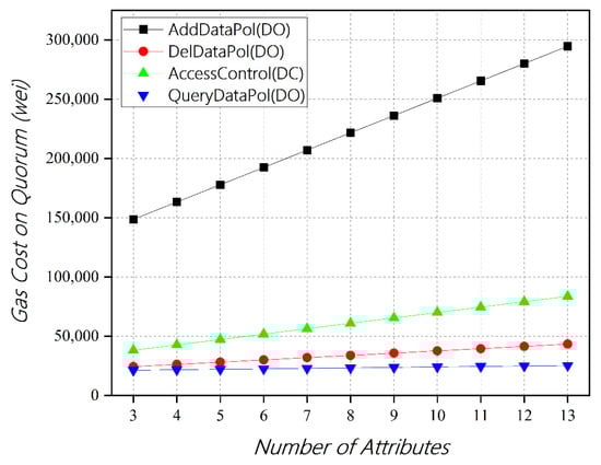 Furthermore, we recorded the comparison of the gas cost of calling , , , and  operations in the access control contract when the scheme in this paper involves different quantity attributes, as shown in Figure 9.