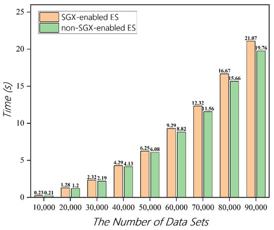 We assume that the  has captured the  event triggered by the client and downloaded the corresponding data set from IPFS. First, we developed two programs with the same data processing capabilities on the server, one on an SGX-enabled server and the other on a non-SGX-enabled server. We used data sets of different sizes to test the data processing time in the two environments and executed the data processing process 10 times for each data set. Finally, we took the average test time as the experimental result. We conducted experiments in the two environments to compare the difference in data processing performance before and after the SGX function was enabled. Figure 10 compares data processing results before and after the SGX function was enabled on the server. Generally, the data processing time in both environments increases with the data set size. Data processing times of the same size with SGX enabled are always higher than without SGX enabled. When the data set is small, the data processing time of the two cases is the same. The time difference between the two cases gradually increases with the size of the processed data set. Mainly, when the data set is 90,000 pieces of data, the time difference between them is 1.31 , which is still an acceptable range in most cases.