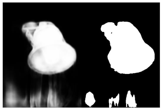Only the contour information cannot be combined with the results of semantic soft segmentation. Ideally, the main part should be white, not just the outline. Therefore, by analyzing the intermediate results of the operation of the algorithm, we can obtain the desired gray image, and process the gray image at the same time: there may be light white pixels in the black area, which we don’t want to keep. Binarize the gray image and keep the obvious white area. Examples of the results before and after processing are shown in Figure 6 (the left side is the execution result of the original significance detection, and the right side is the resulting diagram after binarization of the gray image).