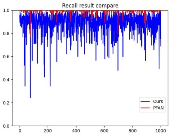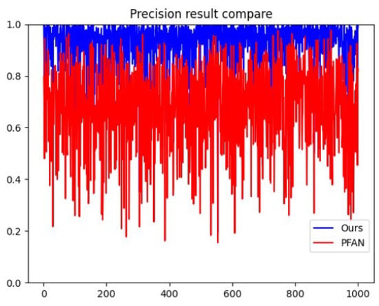Firstly, the evaluation standard of this paper adopts the common accuracy and recall, and binaries the results of the algorithm and the manually marked truth map, selects the gray value of 0–255 as the threshold and uses the following formula to calculate the specific accuracy P and recall R. Here, this algorithm is compared with the PFAN algorithm and is divided into two graphs to compare the accuracy and recall, respectively: