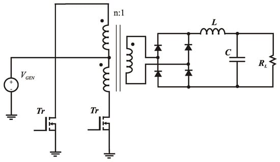 It is a common case that the output voltage of a generator in a renewable power source is not high enough, which requires the usage of a DC/DC converter to increase the voltage. Depending on safety standards and/or voltage level requirements, different topologies, namely with or without galvanic isolation, can be employed. A boost converter is often used topology without galvanic isolation [7,8,9,10], while full bridge and push–pull (Figure 1) topologies are selected when galvanic isolation is required or when the ratio between input and output voltage is high enough to bring in some safety concerns [10,11,12,13]. The push–pull converter is simpler from the control standpoint in comparison to full bridge topology. This is because it contains only two switching elements on the primary side.