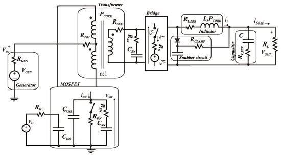 Equivalent circuit of the push–pull converter, including the parasitic elements, is depicted in Figure 2. When MOSFET is used as a switching element, it can be modeled with RON (when turned on). The model also includes the transistor input capacitance CISS. Diode (forward-biased) is modeled using constant voltage source VD and resistance RD.