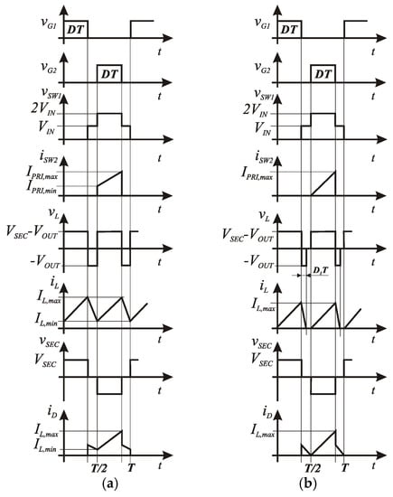 The waveforms of characteristic voltages and currents for the push–pull converter (both operating modes) are illustrated in Figure 3.