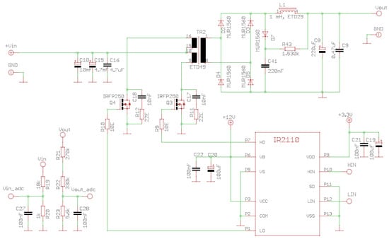 Figure 5 shows electrical schematic of the push–pull converter. Integrated circuit IR2110 was used as a driving circuit for the transistors. To protect diodes in bridge rectifier from voltage spikes, we used a voltage limiter made of diode D7, capacitor C41, and resistor R43. Hardware prototype of the push–pull converter is shown in Figure 6.