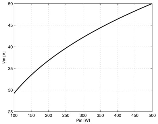 When validating the power loss model of the converter, we preserved the relationship between the input voltage and the input power as the converter was a part of a wind turbine with a PM generator, whose characteristic is shown in Figure 7. The switching frequency was changed during an experiment in the range from 10 to 100 kHz with a 10 kHz increment.