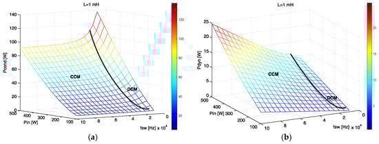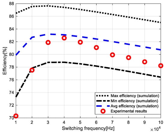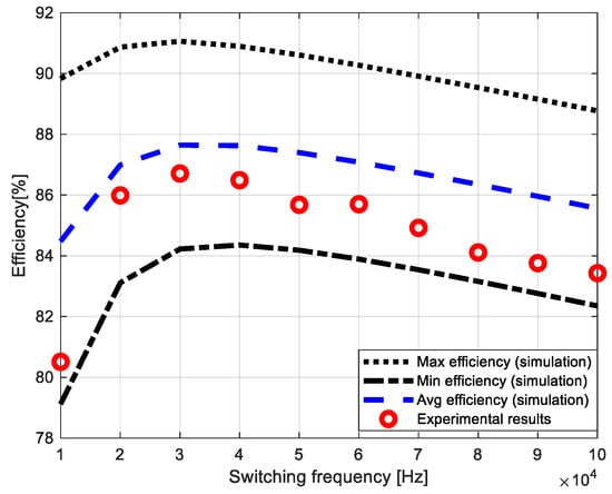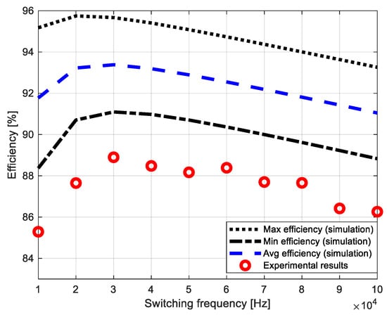 Efficiency of the converter, as a function of switching frequency, is depicted in Figure 8, Figure 9 and Figure 10. Here, we note that the figures show the efficiency for different values of input power.