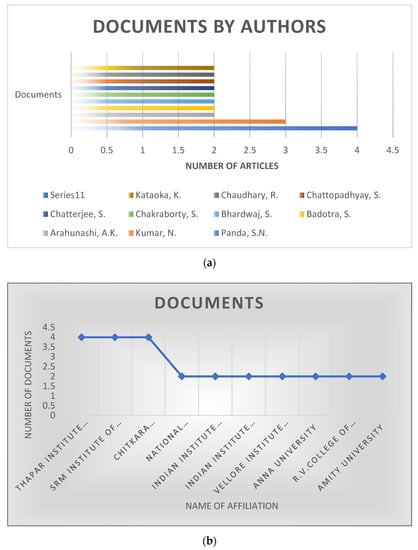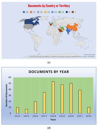 SDN controllers are the ‘brains’ of a software-defined network [23,24,25,26,27,28]. They control the flow of data connecting the switches and routers, ‘below’, and the apps and business logic, ‘top’. It may perform a variety of simple duties, as well as more complicated ones like running analytic algorithms and coordinating new rules across the network. Searching is an important component of performing a systematic review since it gives you a foundation for your study. The search approach should be thorough and objective, as well as simple and repeatable. The work done on the comparison of SDN controllers in the last 9 years is given below, shown in Figure 9a–f. In our search, we employed terms such as keywords (authors, keywords, and countries) and index/subject (relevant sources, clusters) terms. This investigation is based on publications found in the Scopus electronic database. In this study, the quality of library services has been examined in relation to publishing and citation patterns during the previous 11 decades (2012–2022). The top authors, nations, organizations, journals, types of collaboration, highly cited publications, etc., are also examined in this bibliometric study. Data extraction from the Scopus databases has been performed using it. A thorough search strategy is developed to extract the most pertinent data sources. Excel, Biblioshiny, Cite Space, and the VOS viewer software have all been used for data analysis. It has been discovered that 353 items in total are published in Scopus throughout this time. India is reported to be the most productive country, with the most productive organizations, authors, and author partnerships. This appears to be the first thorough bibliometric analysis that integrated productivity and citations, centrality, and citation impact to offer an overall picture of the literature’s contribution to library service quality. Most studies were published in the year 2019 (n = 54), and this year had the highest amount of research published. The search is restricted from 2012 to 2022, as shown in Figure 10a–c.