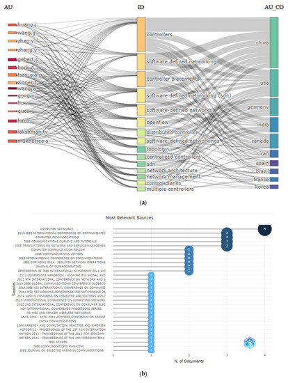 (a): Three fields-plot between the authors, keywords plus, and countries through Biblioshiny. (b): Most relevant sources and cumulative numbers of research documents related to SDN controllers. (c): Clusters by authors coupling.