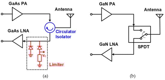 Based on the supremacy of GaN devices, the research and development of the GaN HEMT-based LNAs has also been intensified from the perspective of design simplicity, low cost, and enhanced noise performance. In fact, FEMs using gallium arsenide (GaAs) technology have been widely utilized in various wireless applications over the last decade because GaAs devices generally provide good electron mobility and noise characteristics [,,,]. However, as depicted in Figure 1a, the limited high-power robustness of GaAs devices necessitates additional protection circuits such as an isolator and/or a limiter at the input of the receiver front end, which substantially exacerbates the design complexity and noise performance of the FEM design. On the other hand, a GaN HEMT-based LNA with a single-pole double-throw (SPDT) switch (Figure 1b) no longer needs those protection circuits owing to their own inherent high-power endurance []. Therefore, through the elimination of these extra protection circuits, reduced size and improved noise performance can be realized in the FEM design with the additional possibility of a low-cost single-chip solution by integrating the LNA, PA, and SPDT within a single die. Moreover, as the scaling of GaN technology shrinks and corresponding breakdown voltage increases, the noise characteristic of GaN devices becomes comparable to that of their GaAs and indium phosphide (InP) counterparts. Because of these benefits, various GaN HEMT-based LNAs have been reported in recent studies [,,,,,,,]. However, in the design of GaN HEMT-based amplifiers, stability performance is also a major concern, which is directly related to the reverse isolation characteristic (S12) of the amplifier. Specifically, in the mmWave frequency range, high frequency path losses and parasitic capacitance readily affect isolation characteristics. This eventually causes an extra design trade-off between stability and maximum available gain (MAG) performance.