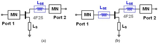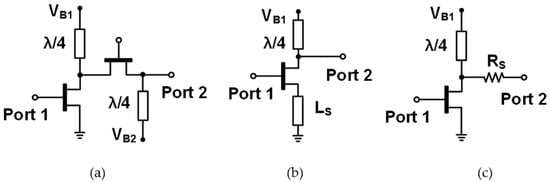 Figure 2 shows the stability enhancement configurations that have been generally applied to MMIC designs. First, a cascode configuration, as shown in Figure 2a, is composed of stacked CS and common-gate (CG) stages and basically offers high reverse isolation from the output to input ports owing to its own shielding effect. Interestingly, as the number of stacked stages increases, the amount of reverse isolation and the corresponding stability are improved accordingly []. However, relatively complex independent biasing for each CS and CG device is required to adjust the optimal bias conditions using several supply voltage sources. The source degeneration of the single-stage amplifier in Figure 2b also improves the overall stability by applying a negative feedback through the LS while sacrificing the MAG and noise performance. This approach is also beneficial for achieving linearity enhancement and the possibility of simultaneous power and noise matching in the design. In Figure 2c, the utilized series resistor at the input or output port of the single stage directly increases reverse isolation by providing a higher series impedance. However, this configuration substantially exacerbates the overall gain and noise performance of the amplifier because noisy impedance is added in the signal path.