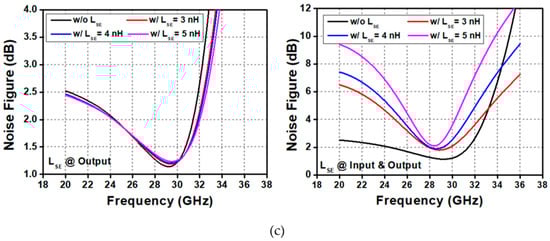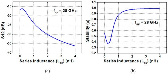 In the proposed design, a series inductor (LSE) instead of the series resistor is adopted at the output to enhance the stability of the amplifier (Figure 3). Similar to the series resistor-based technique (Figure 2c), it readily decreases S12 and improves reverse isolation by offering a higher output impedance at the operating frequency. However, the proposed technique does not cause significant noise performance degradation owing to its inherently low resistance. Moreover, the added series inductor partially cancels the parasitic capacitance at the output node. Consequently, this mitigates the MAG degradation caused by the series impedance in the signal path. Figure 4 shows the S12 and μ simulation results of the single-stage CS amplifier (4F25) (Figure 3) by adopting different values of the series inductor (LSE) at the drain of the GaN device at 28 GHz frequency. As expected, the simulated S12 and μ values are improved when larger inductors are employed.