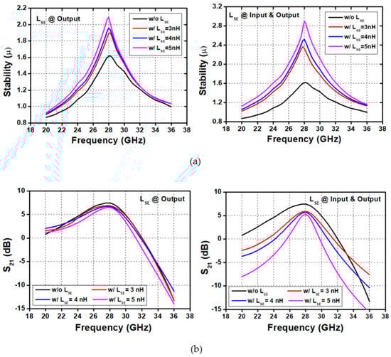 In addition, the stability performance of the single-stage CS amplifier was evaluated in simulations with matching networks (MNs) to reflect all the scattering parameters (S11, S12, S21, S22) of the network. Figure 5 depicts the single-stage CS amplifier configurations with matching networks and series inductor(s) at the input and/or output nodes. In these simulations, source degeneration (L = 130 μm and W=15 μm) is also utilized in combination with the series inductor-based technique to further enhance the overall stability performance. The simulated small-signal gains (S21s) and μ values are shown in Figure 6. As can be seen from Figure 6, larger values of LSE result in a more enhanced stability (μ) performance in the overall frequency band. Moreover, when series inductors are utilized at both the input and output ports (Figure 6b), stability performance is further enhanced. Although the small-signal gains (S21s) and NFs of the single-stage amplifiers are degraded owing to the effect of series impedance (LSE) in the signal path, the amount of degradation is mitigated through partial cancellation of the parasitic capacitance at the source or drain node with series inductors.
