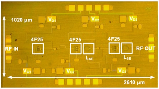 The GaN HEMT LNA designed in this work was fabricated using the process design kit of NP15-00, a GaN-on-SiC substrate technology with a gate length of 0.15-μm, which was provided by the Win Semiconductors Corporation foundry. Considering the stability, minimum NF, and MAG features at the operating frequency, a transistor size of 4 × 25 μm (4F25) GaN HEMT was chosen, which has a breakdown voltage of more than 120 V, a current gain cutoff frequency (fT) of approximately 34.5 GHz, and a maximum oscillation frequency (fMAX) of approximately 125 GHz. In addition, this process provides two interconnected metal layers, high-reliability metal–insulator–metal capacitors, and precision tantalum nitride resistors for full MMIC designs.