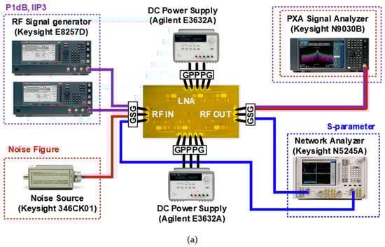 The proposed 26–30 GHz GaN HEMT LNA MMIC that adopts the series inductor-based stability enhancement technique was fabricated using 0.15-μm GaN-on-SiC technology, and its performance was demonstrated from bare-die measurements. Figure 8 shows a die microphotograph of the implemented design, which occupies an active area of 2.61 mm × 1.02 mm (2.66 mm2), including bonding pads. All test measurements were conducted using a single die via on-wafer probing. RF signals were injected externally and measured at the RF input and output ports, respectively, using GSG-type probes, whereas the required gate and drain bias voltages were supplied through GPPPG-type DC probes. The overall insertion loss arising from the cables and probes was measured at the desired frequencies and used to compensate for the measured results. Figure 9 shows the measurement setups for the S-parameter, NF, and linearity performance characterization, focusing on band n257 and band n261 of the 5G NR FR2.