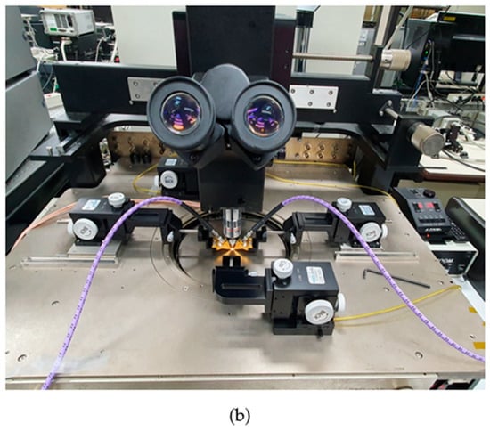 Measurement configurations: (a) a block diagram of the S-parameter, noise figure, P1dB, and IIP3 performance measurements and (b) a probe station setup.
