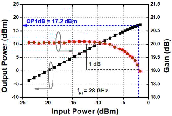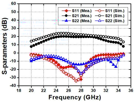 Figure 10 shows the measured and simulated S-parameter results, which include the small-signal gains (S21s) and input and output return losses (S11s and S22s). The designed LNA achieves a maximum small-signal gain of 20.2 dB with a 1-dB bandwidth of approximately 7 GHz (23.6–30.3 GHz). As is also seen from Figure 10, a gain degradation of 2–3 dB is observed in comparison with the simulation results. This is mainly caused by a slight deviation from the optimal matching condition. The attained return loss results are less than –10 dB over the 26–30 GHz frequency range.