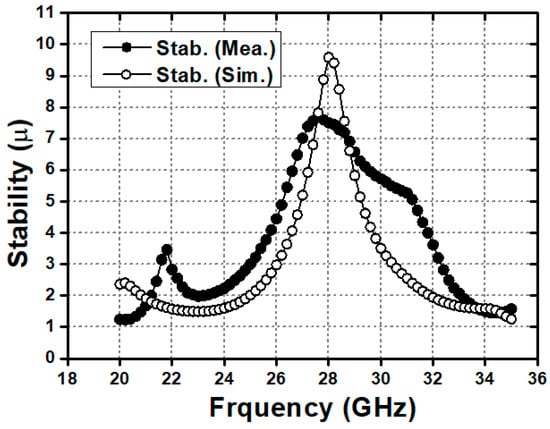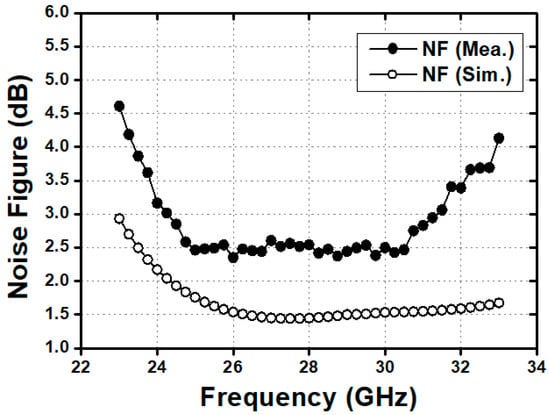 To primarily validate the stability performance improvement of the designed LNA over the frequency range, μ values were calculated from the measured S-parameter values, and the results are presented in Figure 11 along with the simulated μ values. It is noted that μ enhancement is achieved with the peak value of μ = 7.68 at 27.6 GHz, even if the peak frequency is slightly shifted to a lower frequency in comparison with the simulated stability results. Moreover, the designed LNA with the stability enhancement technique achieves an unconditionally solid stable condition, where μ is greater than 1 over the frequency range of 20–35 GHz. The measured and simulated NFs of the designed LNA, shown in Figure 12, range from 2.42 to 2.56 and 1.5 to 1.6 dB, respectively, in the operating frequency. The measured NFs of the implemented design are approximately 0.9 dB higher than the simulated NFs owing to the degraded small-signal gain and deviated noise-matching condition.
