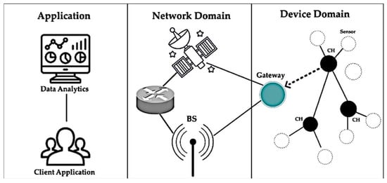 The Internet of Things (IoT) architecture as depicted in Figure 2, consists of three domains: device or hardware, network or communication, and a layer of interfaces and services. The first layer includes sensors and actuators. For instance, an irrigation system might include individual sprinkler heads, moisture sensors, temperature sensors, and actuators, which are connected to the network using different protocols. In this layer, the end devices use a microprocessor based on the Interplanetary File System (IPFS), which is used for distributed data storage and data integrity while taking into account the problems with centralized systems [9], ARM, or X86 architectures, and a Real Time Operating System (RTOS) hardware operating system. For the application software layer, there are custom applications, cryptographic protocols, and third-party libraries and drivers. The network domain, or communication layer, presents the process of collecting and transferring data to the application domain. Different protocols are used to connect objects with the gateways and these to the internet and cloud applications.