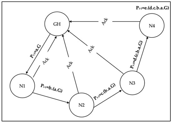 For example, with five nodes (GH, N1, N2, N3, and N4), having corresponding private keys , respectively, if GH is the group head node, according to Figure 3, the shared keys ( and ) for node N1 and N2 is generated and distributed in the following order.