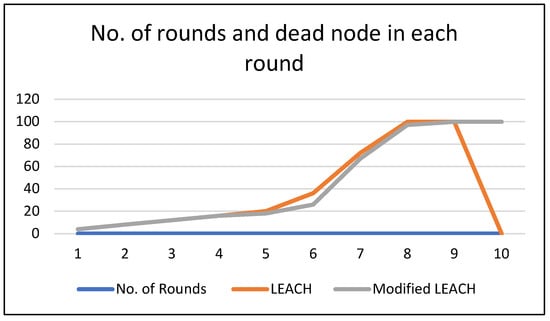 Figure 7 illustrates the difference between the LEACH and modified LEACH routing protocols. The number of dead nodes in the conventional LEACH from round 5 starting up is clearly visible when compared to the proposed protocol. In addition, the last dead node of the proposed protocol extends up to ten rounds, while the last dead node in the original LEACH is in round nine. The enhanced threshold condition in the proposed protocol is mainly responsible for the network’s extension stability. Comparisons are made between proposed protocols for various network sizes to determine the networks’ lifespan and the impact of increasing node separation.