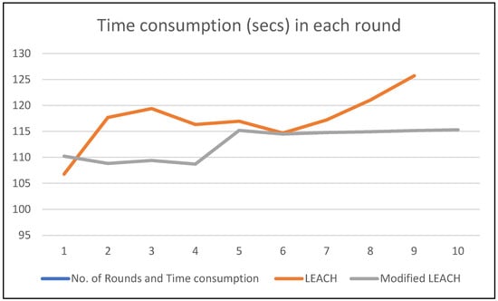 Figure 8 indicates that the time consumption to compute a key in each round takes less compared to the original LEACH in the network. This is mostly due to the fact that the distance factor and remaining energy are taken into account during the selection of cluster heads. In the proposed protocol, closer nodes are chosen as head nodes more often than nodes that are farther apart. This means that the total amount of time needed for each round is less.