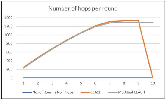 In Figure 9, the links between the number of hops that are required to find CH are depicted. The most used hop in each round is done by the LEACH protocol, even though the percentage difference is too small. As the network in terms of size increases, the number of hops will also increase.