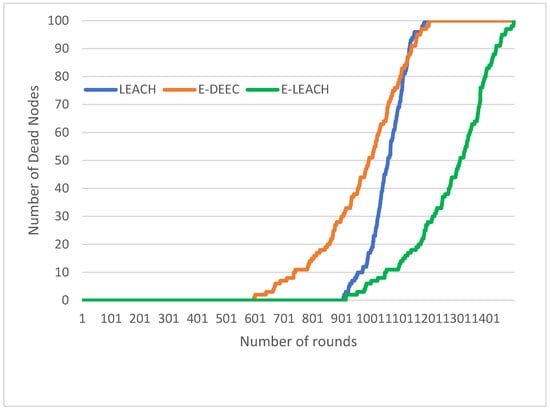 Figure 10 presents a performance comparison between our proposed enhanced LEACH protocol (E-LEACH), the original LEACH (LEACH), and another version of the improved LEACH protocol (E-DEEC) proposed in reference [26,40]. The simulation was conducted using the same node parameters presented in Table 5 In each case, 100 sensors were placed randomly in the field and the positions of the nodes were maintained throughout the experiment. The simulation was set up to run for 1500 rounds and the corresponding number of dead nodes were recorded after each round as depicted in Figure 10. It can be seen from the figure that in the original LEACH protocol, instances of dead nodes started to appear at around 600 rounds and all the nodes died at about 1100 rounds. Meanwhile, the E-DEEC of reference [26,40] has improved on the original LEACH by prolonging the instance of the appearance of the first dead node to around 900 rounds, but eventually all nodes die at about the same time with the original LEACH. However, the proposed E-LEACH has improved on both the initial incidence of dead nodes (around 904 rounds) and after 1496 rounds there are still nodes that are alive which is an indication of better energy management and extends the lifespan of the network.
