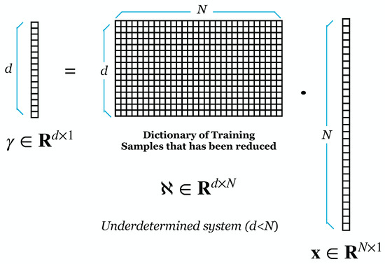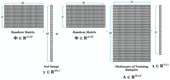 Wright et al. [9] proposed using RP to reduce the dimensionality of face images. We demonstrated experimentally that the SRC is resistant to DR. However, ref. [9] lacked a theoretical understanding of why the SRC is resistant to such dimensionality reduction. Majumdar and Ward [38] prove theoretically and practically that SRC is robust to dimensionality reduction by RP. Our experiment also tested that using RP for DR gives good results on recognition rate and lowers the computational cost [34]. Figure 1 shows the initial process of SRC, where M is the image size and N is the number in the training image. Suppose can result from an overdetermined system. Figure 2 shows the projection of the dictionary of training samples with a random matrix (). The result of the DR is shown in Figure 3.