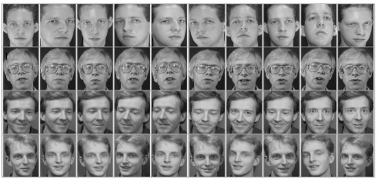 We used AT&T [39], Yale B [40], Georgia Tech (GT) [41] and the AR [42] dataset for testing the recognition accuracy. The AT&T dataset bundle includes 400 images. There are 40 classes or subjects, and each class contains 10 images. In this experiment, we used 200 images for training and 200 for testing. The photographs were taken at various times, with different lighting, face expressions (open vs. closed eyes, smiling vs. not smiling) and facial details (glasses vs. no glasses). Figure 4 shows several subjects of the AT&T dataset.